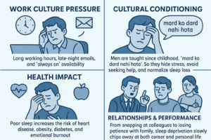 2. Cultural Conditioning – Men are taught since childhood, “mard ko dard nahi hota”. So they hide stress, avoid seeking help, and normalize sleep loss.