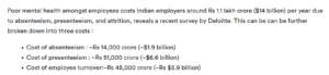 • A Deloitte report revealed that poor mental health costs Indian companies nearly ₹1.1 lakh crore every year. Of this, ₹14,000 crore is due to absenteeism (When employees don’t show up to work), ₹51,000 crore due to presenteeism (employees physically present at work but mentally disengaged), and ₹45,000 crore due to attrition (gradual loss of employees from an organisation over time).